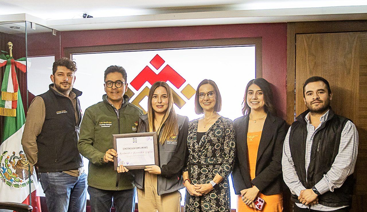 La comisionada presidenta del ITAIH, Myrna Rocío Moncada Mahuem, entregó una Constancia al presidente municipal de Mineral de la Reforma, Eduardo Medécigo Rubio, por haber cumplido su primer proceso de verificación 2025 con cumplimiento de acuerdo con su acta de verificación.